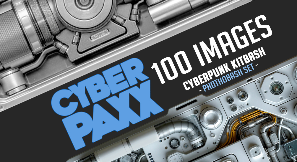 Cyber Paxx is a collection of 100 Cyberpunk themed Images featuring a mix of control panels, motors, pipes tubing, wiring and more perfect for kit-bashing / Photobashing or reference material for sci-fi, cyberpunk, or general futuristic themed art.